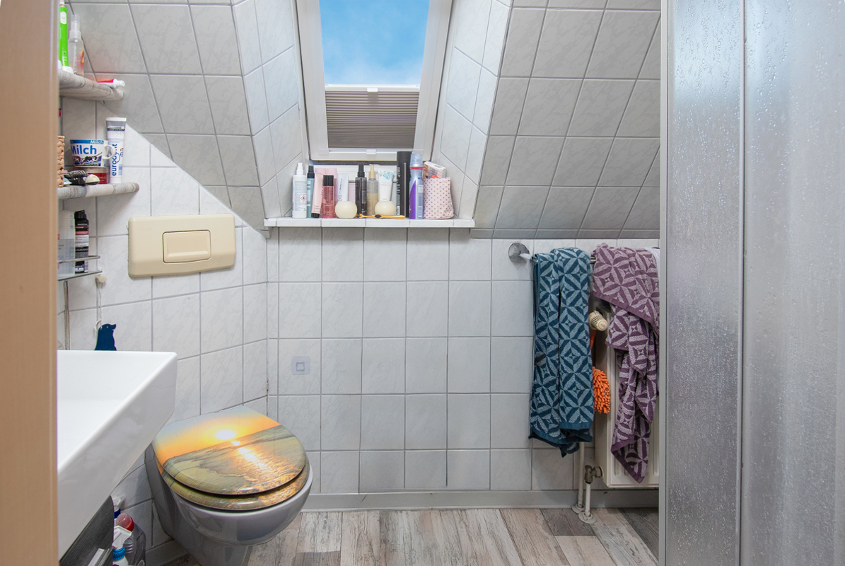 Im Dachgeschoss erwarten Sie zwei geräumige Schlafzimmer, ein praktischer Ankleideraum sowie ein weiteres Duschbad mit WC. Große Fenster sorgen für viel Tageslicht, und elektrische Rollläden aus dem Jahr 2008 bieten zusätzlichen Komfort und Sicherheit.