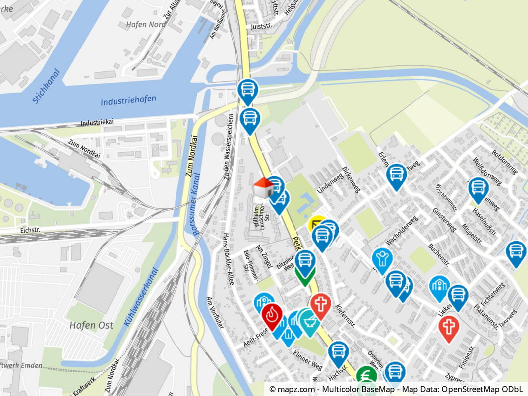 Die Wohnungen befinden sich im Stadtteil Borssum. Borssum ist ein östlich des Hafens gelegener Stadtteil der Seehafenstadt Emden. Einkaufsmöglichkeiten sind bequem zu Fuß zu erreichen. Eine Bushaltestelle befindet sich ebenfalls direkt vor der Tür. Der nächste Kindergarten ist ca. 8 Gehminuten entfernt.