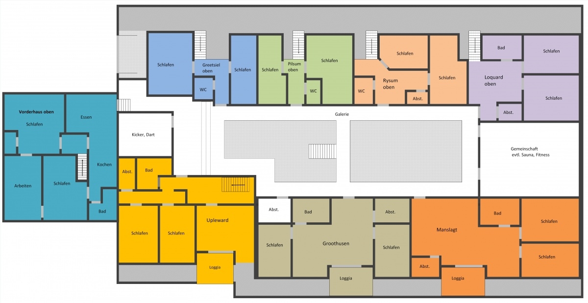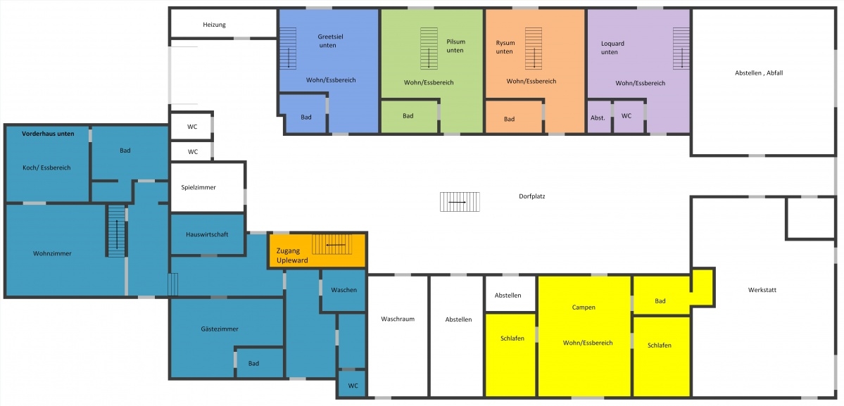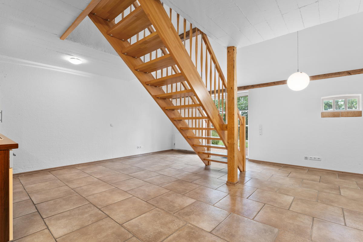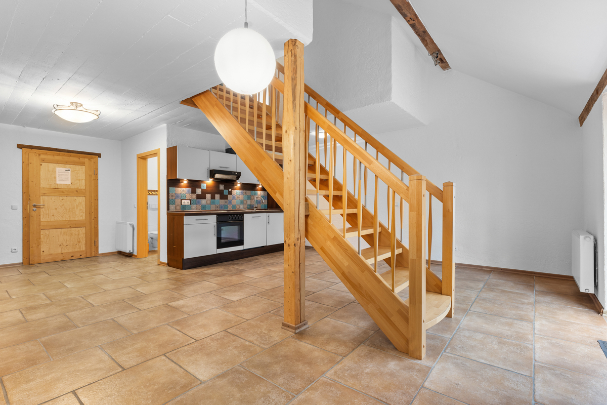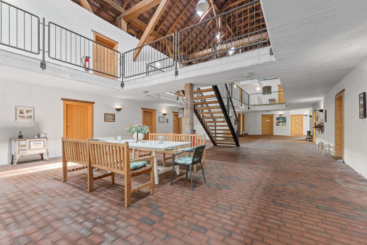 Zu der Wohnung gelangen Sie durch den sehr aufwendig mit einer Galerie erstellten großen Innenraum der ehemaligen Scheune, dem sogenannten Dorfplatz, von dem aus ebenfalls weitere Nutzflächen (Waschmaschinen- und Trockenraum, Fahrradraum), die teilweise zu den Wohnungen gehören, erreichbar sind.