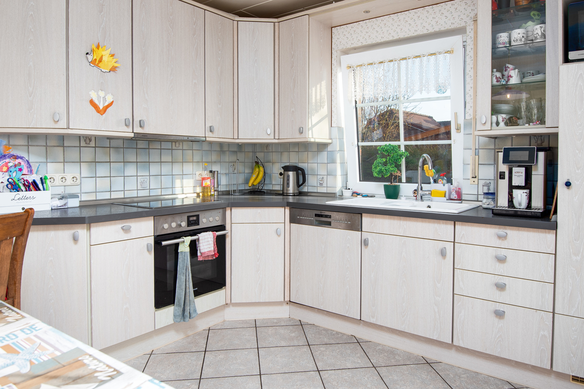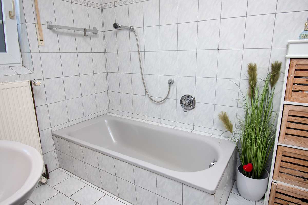 Die helle Küche bietet viel Platz und verfügt über eine angrenzende Speisekammer. Ein Gäste-WC, eine Diele, ein Wannenbad mit WC sowie ein Abstellraum mit den Hausanschlüssen komplettieren das Erdgeschoss.