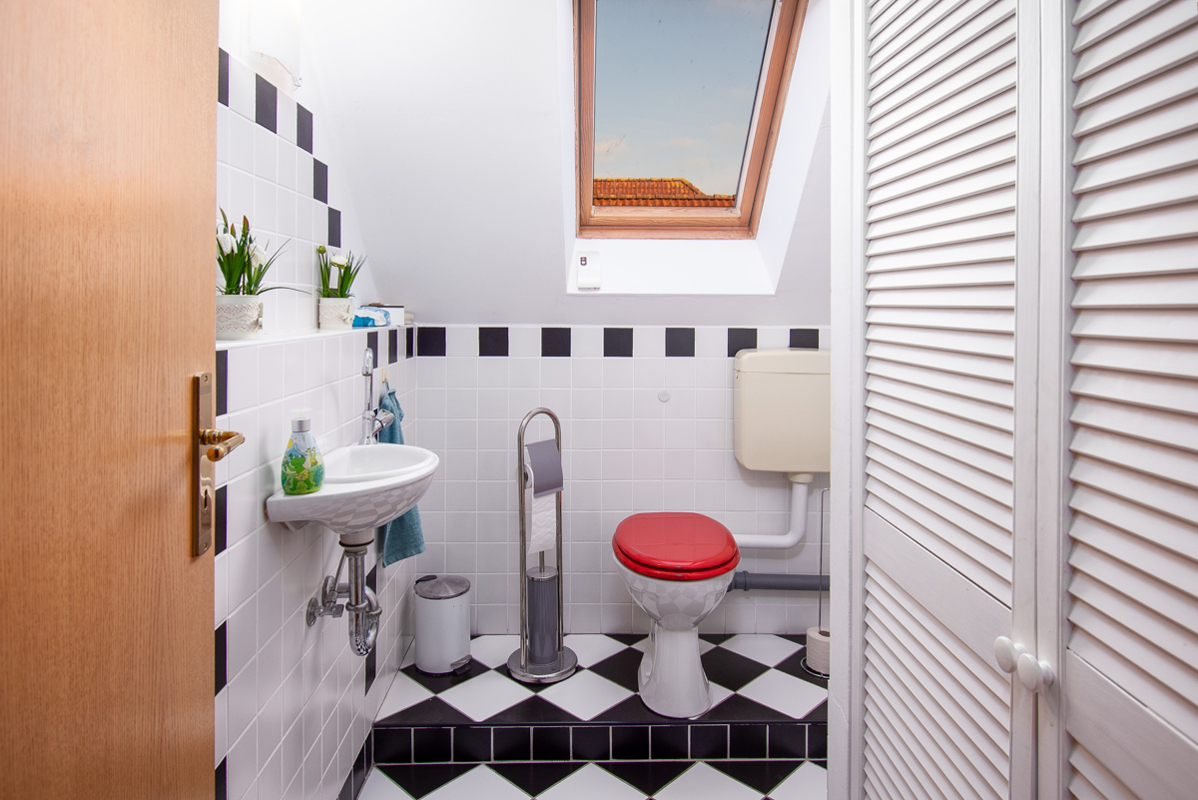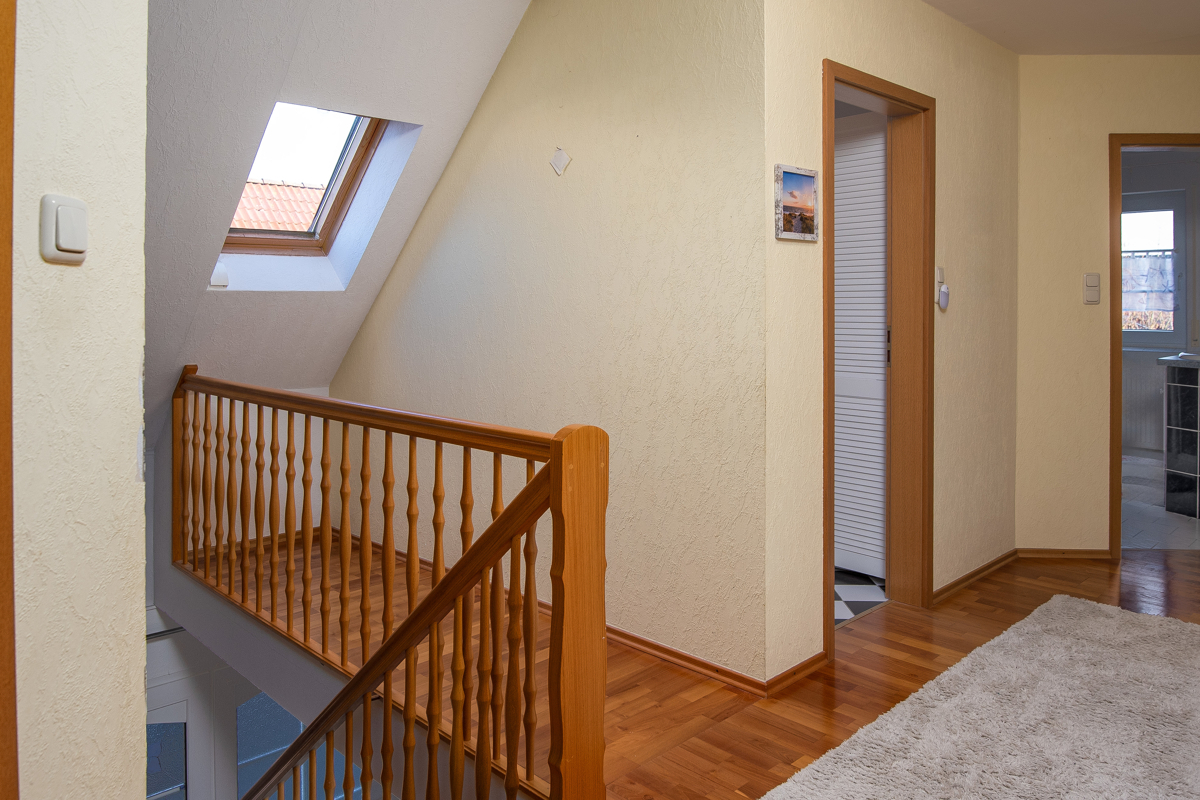 Im Obergeschoss befinden sich drei weitere Zimmer sowie ein Tageslichtbad mit Dusche und Badewanne. Ein zusätzlicher Raum mit WC und einem separaten Bereich für die Leasingtherme rundet das Platzangebot ab. Der Dachboden, erreichbar über eine Bodentreppe, bietet zusätzlichen Stauraum.
