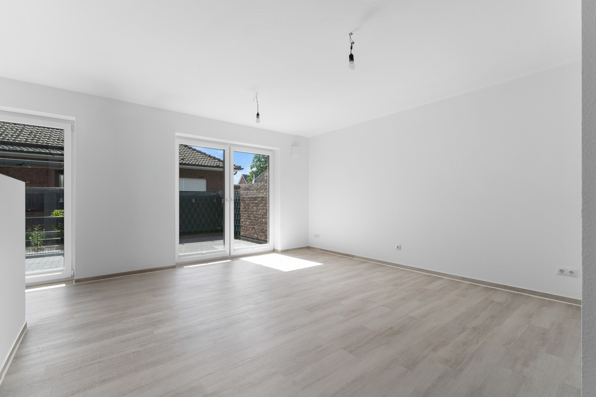 Der offene, lichtdurchflutete Wohn- und Essbereich mit bodentiefen, dreifach verglasten Fenstern ist das Herzstück der Wohnung — hier verschmelzen Wohnen, Kochen und Entspannen zu einem modernen Lebensgefühl. Die hochwertige, voll ausgestattete Küchenzeile lässt keine Wünsche offen. Von hier aus gelangen Sie direkt auf die große Terrasse mit elektrischer Allwetter-Markise und in den liebevoll angelegten, eigenen Garten — Ihre ganz private grüne Oase.