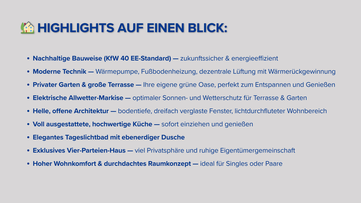Diese exklusive Erdgeschosswohnung vereint zeitloses Design, nachhaltige Bauweise und höchsten Wohnkomfort in einer der besten Lagen von Norden. Sie ist der perfekte Rückzugsort für alle, die stilvolles, modernes Wohnen schätzen, ein grünes Umfeld genießen und gleichzeitig die Vorteile einer urbanen Anbindung nicht missen möchten. Einziehen, ankommen und jeden Tag genießen — hier wird Wohnen zu einem neuen Lebensgefühl!